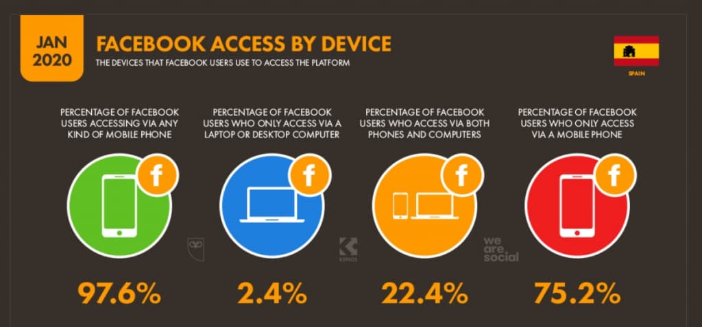 Aunque en todo el mundo se habla del salto que va a suponer que la mayor parte del público acceda a sus sitios preferidos a través del móvil abandonando cada vez más los dispositivos de escritorio, esto parece haberle pasado a Facebook hace mucho. De hecho, el 97.6% de los usuarios accede mediante dispositivos móviles, mientras que solo el 2.4% lo hace desde ordenadores.