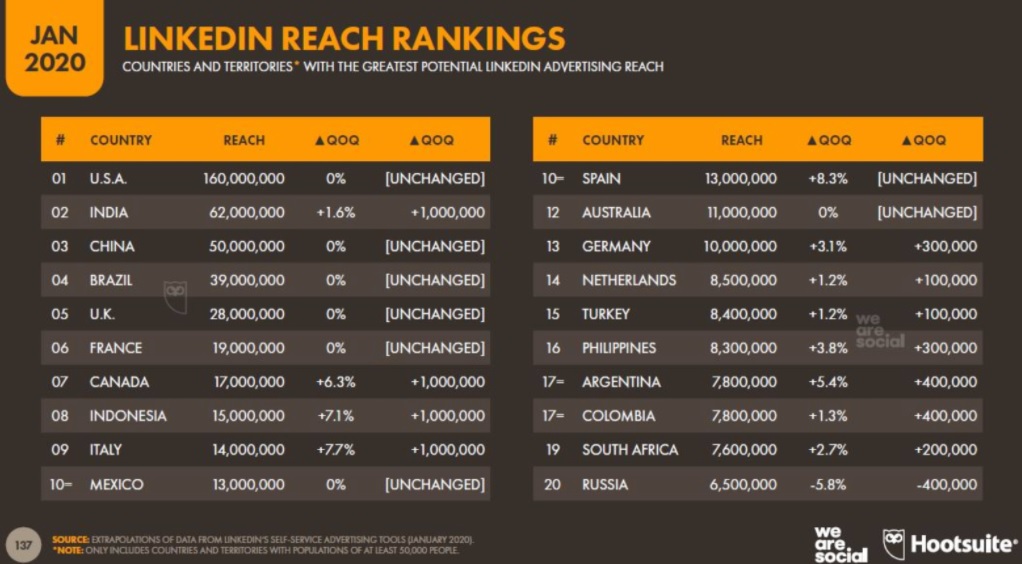 La imagen que aparece encima de estas líneas resume cuáles son los países en los que linkedIn tiene un mayor alcance. España aparece en el puesto diez, por lo que realmente es un social media relevante.